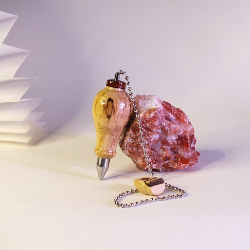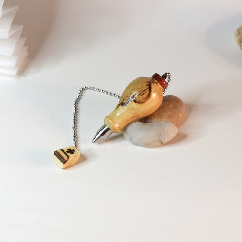 "Carpinus" * ____ Pendule réalisé à la main en tournage sur bois dans mon atelier à La Possonnière 49170, en Anjou. ____ Pendule en bois de Charme échauffé. Symbolisme: Carpinus, la magie. Le charme est un arbre vigoureux peu sujet aux maladies, d’où l’expression «se porter comme un charme». Le bâton de charme, aux bouts fourchus, est réputé protéger des esprits malins, de leurs tours d’illusions et de leurs humeurs. Son bois sert à fabriquer des baguettes "magiques" utilisées par les magnétiseurs. Intelligence, symbolise aussi la femme. ____ Pendule pour la radiesthésie classique mais aussi la radiesthésie physique. Il est capable de capter la totalité des ondes naturelles, quelles soient magnétiques, électriques, radioactives ou autres**. Emetteur et récepteur. ____ Sa pointe effilée facilitera la recherche sur plan ou photo. ____ Pour radiesthésistes débutants ou confirmés qui aiment les pendules de poids moyennement lourds (26g). ____ C'est une pièce unique, ainsi vous recevrez le pendule que vous voyez en photo. ____ Pour créer mes pendules de radiesthésie, j'utilise des bois de ma région à plus de 90% et bois exotiques de réemploi. ____ *Carpinus, Latin de bois de charme. **Utilisé avec la double antenne non fournie. (Voir le site internet Reviha, la radiesthésie étonnante) ____ Référence : 25-42bm-09