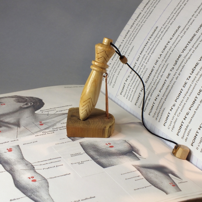 "Thot" ___ Pendule réalisé par mes soins en tournage sur bois dans mon atelier en Anjou. ___ Tourné en bois de frêne, lesté pour obtenir le poids idéal du pendule de Thot (22g). ___ Respecte le nombre d'or dans sa forme (1,618 cm) et la taille (7 cm de la pointe à la limite des chevrons supérieurs) Quatre chevrons à sa base et deux dans sa hauteur. ___ Le pendule de Thot, à la fois émetteur et récepteur. Ce sont ces formes et les dessins (chevrons) qui déterminent en grande partie la nature de ses propriétés émettrices et réceptrices.(Ondes de formes) Le pendule de Thot est un émetteur puissant et cela en fait un outil de choix pour « charger » l’eau, un objet ou un lieu. De plus, c’est un pendule neutre qui ne nécessite pas d’être purifié avant chaque utilisation. ___ Symbolisme : À l'instar du Chêne, le Frêne est un symbole de solidité puissante. On en faisait des hampes de lances. Dans les traditions scandinaves, cet arbre symbolise l'immortalité et sert de lien entre les trois niveaux du cosmos. Dans les anciens pays baltes, l'homme étourdi et un peu niais est qualifié de frêne car il est considéré comme aveugle. En effet, ne sachant pas quand vient le printemps, il reste longtemps dénudé. Tandis qu'à l'automne, craignant de paraître ridicule à nouveau, il est le premier à se dépouiller rapidement de toutes ses feuilles. ___ C'est une pièce unique, ainsi vous recevrez le pendule que vous voyez en photo. ___ Des petites imperfections peuvent se voir sur la surface en fonction du type de bois (Nœuds, blessures ....), cela ne remet pas en cause la qualité du pendule. ___Référence : 25-58tb-12