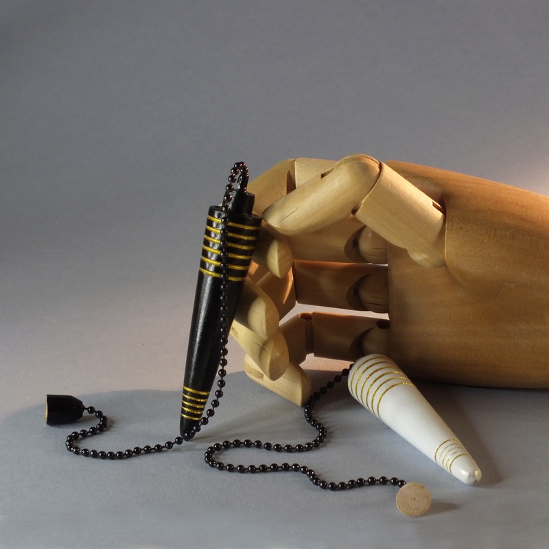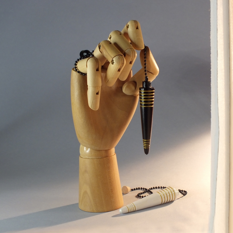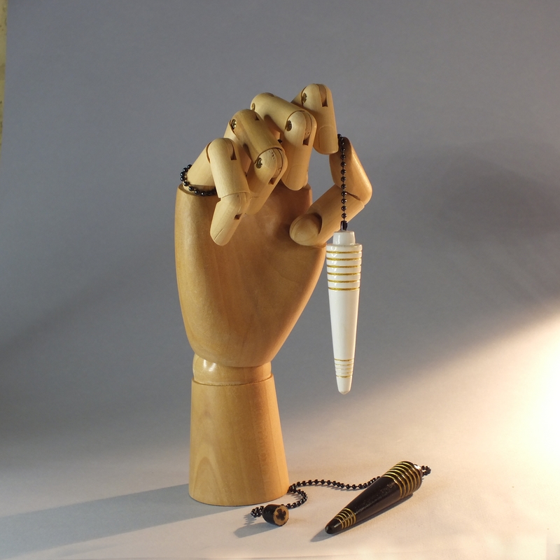 "Ultra n&b*" ___ Pendules réalisés par mes soins en tournage sur bois dans mon atelier en Anjou. ___ Lot de deux pendules de la gamme 'Ultra' N&B (ne sont pas vendus séparément) ___ Pendules pour médium et communication avec le monde spirituel. Il pourront être des outils précieux en amplifiant les perceptions et en affinant les messages reçus. ___ Fabriqués dans du bois de hêtre, peinture et vernis acrylique. Pendules lestés. ___ *Ultra V, latin de 'Au-delà', n&b, un pendule noir et l'autre blanc. ___ Ce sont deux pièces 'uniques', ainsi vous recevrez les pendules que vous voyez en photo. ___ Des petites imperfections peuvent se voir sur la surface en fonction du type de bois (Nœuds, blessures ....), cela ne remet pas en cause la qualité des pendules. ___ Référence : 26-63tb-01