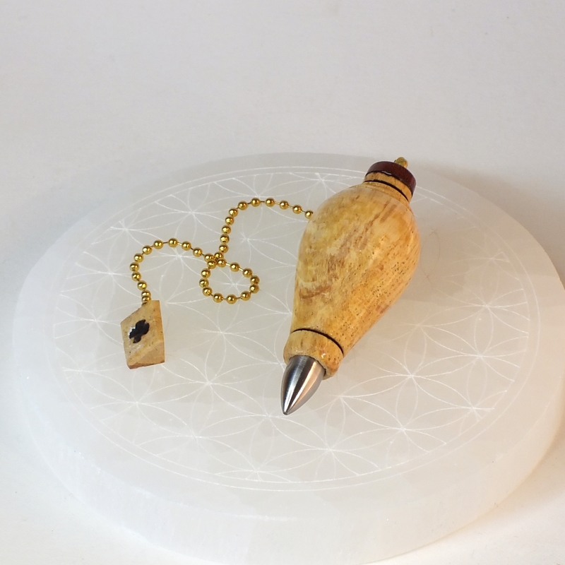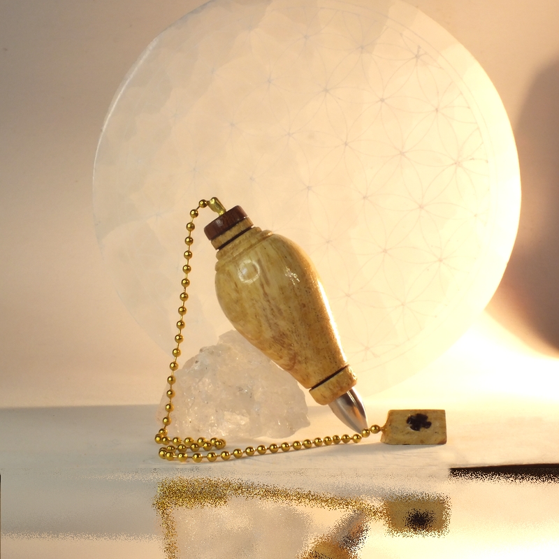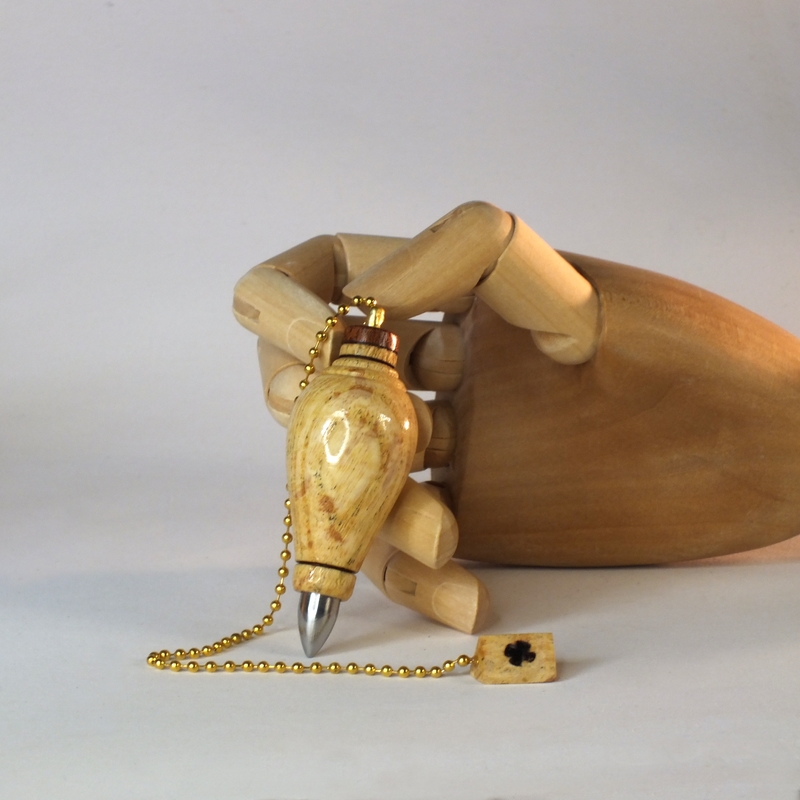 "Comice IV" * ___ Pendule réalisé à la main en tournage sur bois dans mon atelier à La Possonnière 49170, en Anjou. ___ Pendule en bois loupe de platane, âme acier inox. Finition : vernis acrylique. ___ Pendule pour la radiesthésie classique mais aussi la radiesthésie physique. Il est capable de capter la totalité des ondes naturelles, quelles soient magnétiques, électriques, radioactives ou autres**. Il est également possible de l'utiliser pour la radiesthésie classique. ___ Sa pointe effilée facilitera la recherche sur plan, photo... ___ Pour radiesthésistes débutants ou confirmés qui aiment les pendules de poids moyennement lourds (25g). ___ C'est une pièce unique, ainsi vous recevrez le pendule que vous voyez en photo. ___ Pour créer mes pendules de radiesthésie, j'utilise des bois de ma région à plus de 90% et bois exotiques de réemploi. ___ *Comice IV, de par sa forme effilée en forme de poire "comice" / Quatrième du nom. ___ **Utilisé avec la double antenne non fournie. (Voir le site internet Reviha.org, la radiesthésie étonnante) ___ Référence : 26-65bm-01 ___ Dimensions : __Haut : 6,5 cm __Diam : 2,5 cm __Poids : 25 grammes __Chainette : 18 cm ____ Prix : 38 € port non compris.