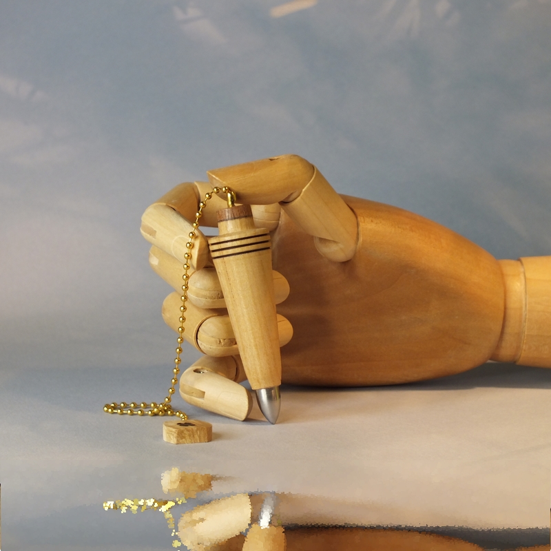 "Modo II"* ___ Pendule réalisé à la main en tournage sur bois dans mon atelier, en bord de Loire, près d'Angers. ___ Pendule tourné dans du bois de hêtre, âme d'acier inox. Finition: Cire de Carnauba. (L'antenne en photo n'est pas comprise dans le prix). ___ Pendule étudié pour la radiesthésie physique (Moderne). Il est capable de capter la totalité des ondes naturelles, quelles soient magnétiques, électriques, radioactives ou autres**. Il est également possible de l'utiliser pour la radiesthésie classique. ___ Pour radiesthésistes débutants ou confirmés qui aiment les pendules de poids moyennement lourds (22g). ___ C'est une pièce unique, ainsi vous recevrez le pendule que vous voyez en photo. ___ Pour créer mes pendules de radiesthésie, j'utilise des bois de ma région à plus de 90%. ___ *Modo II, latin de 'juste'. Deuxième du nom. ___ **Utilisé avec la double antenne. (Voir le site internet Reviha.org, la radiesthésie étonnante) ___ Référence : 26-67bm-01 __ Dimensions : __ Haut : 7 cm __ Diamètre : 2 cm __ Poids: 22 grammes __ Chainette : 18 cm ___ Prix : 38 € port non compris.