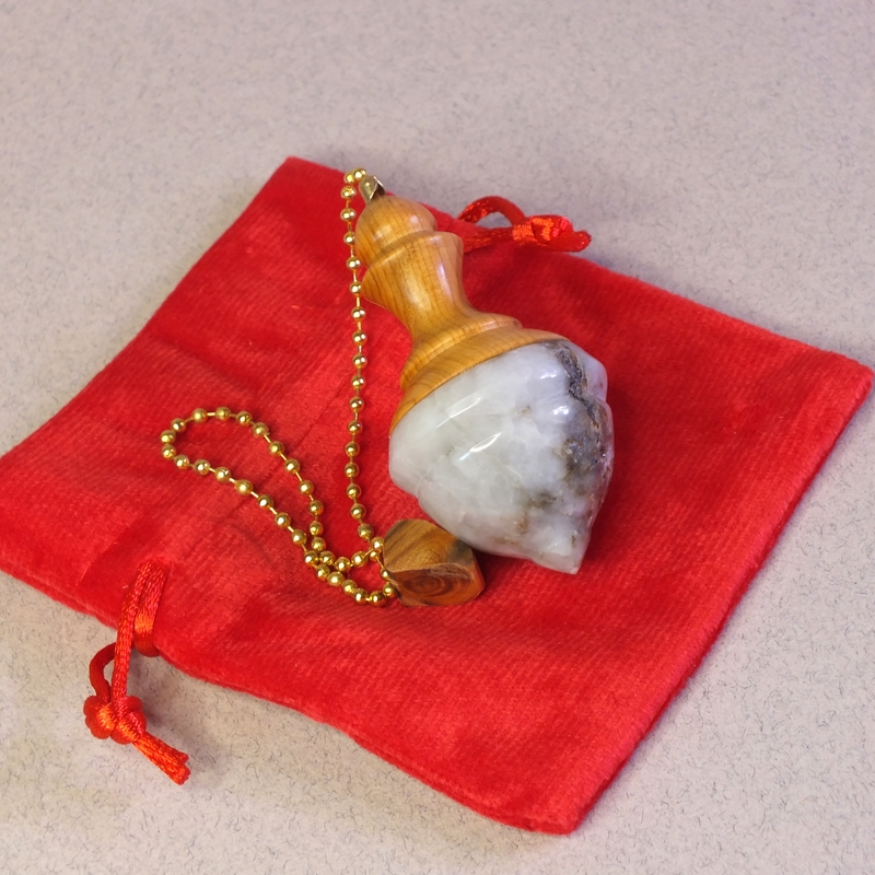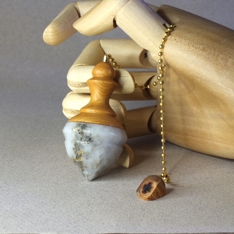 " Tresor " ____ Pendule tourné dans mon atelier, en Anjou, par mes soins. En bois d'If et pierre de quartz. ____ Les pierres utilisées pour la création des pendules sont de simples "cailloux" des chemins, des rivières... Et choisis pour s'intégrer à votre futur pendule. ___ Le prix du pendule ne tient pas compte de la pierre mais du travail de transformation. ___ C'est une pièce unique, ainsi vous recevrez le pendule que vous voyez en photo. ____ Des petites imperfections peuvent se voir sur la surface en fonction du type de bois (Nœuds, blessures ....), cela ne remet pas en cause la qualité du pendule. ___ Réf: 25-32bp-12 __Long : 6 cm __Diam : 3 cm __Poids: 36 grammes __Chainette : 18 cm. ____