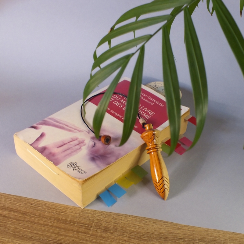 Pendule réalisé par mes soins en tournage sur bois dans mon atelier en Anjou. ___ Tourné en bois d'If, lesté pour obtenir le poids idéal du pendule de Thot (22g). ___ Respecte le nombre d'or dans sa forme (1,618 cm) et la taille (7 cm de la pointe à la limite des chevrons supérieurs) ___ Quatre chevrons à sa base et deux dans sa hauteur. ___ Ce pendule a été travaillé dans du bois d'If, mi-aubier, mi-coeur, ce qui lui donne son originalité. ___ Le pendule de Thot, à la fois émetteur et récepteur. Ce sont ces formes et les dessins (chevrons) qui déterminent en grande partie la nature de ses propriétés émettrices et réceptrices.(Ondes de formes) Le pendule de Thot est un émetteur puissant et cela en fait un outil de choix pour « charger » l’eau, un objet ou un lieu. ___ De plus, c’est un pendule neutre qui ne nécessite pas d’être purifié avant chaque utilisation. ___ Symbolisme de l'If: Dans le domaine ésotérique, l’if commun est souvent utilisé dans les rituels de transformation et de renaissance. Ses feuilles persistantes et son bois dense en font un symbole de longévité et de résistance. L’if est souvent associé à la magie et à la divination, utilisée pour se connecter aux esprits et aux ancêtres. ___ C'est une pièce unique, ainsi vous recevrez le pendule que vous voyez en photo. ___ Des petites imperfections peuvent se voir sur la surface en fonction du type de bois (Nœuds, blessures ....), cela ne remet pas en cause la qualité du pendule. ___ Référence : 26-77tb-03 Dimensions : Haut : 8 cm Diamètre : 1,618 cm Poids : 22 g Cordon : 22 cm Prix : 38 € port non compris.
