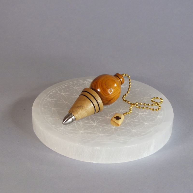 "Lascivia V"* ___ Pendule réalisé à la main en tournage sur bois dans mon atelier, en bord de Loire, près d'Angers. ___ Pendule tourné dans du bois d'If et châtaignier, âme d'acier inox. Finition: Vernis acrylique. ___ Pendule étudié pour la radiesthésie physique (Moderne). Il est capable de capter la totalité des ondes naturelles, quelles soient magnétiques, électriques, radioactives ou autres**. Il est également possible de l'utiliser pour la radiesthésie classique. ___ Pour radiesthésistes débutants ou confirmés qui aiment les pendules de poids moyennement lourds (32g). ___ C'est une pièce unique, ainsi vous recevrez le pendule que vous voyez en photo. ___ Pour créer mes pendules de radiesthésie, j'utilise des bois de ma région à plus de 90%. ___ *Lascivia V, cinquième du nom. **Utilisé avec la double antenne. (Voir le site internet Reviha.org, la radiesthésie étonnante) ___Référence : 26-76bm-03 Dimensions : Haut : 7 cm Diamètre : 2,5 cm Poids : 32 grammes Chainette : 18 cm Prix : 38 € port non compris.