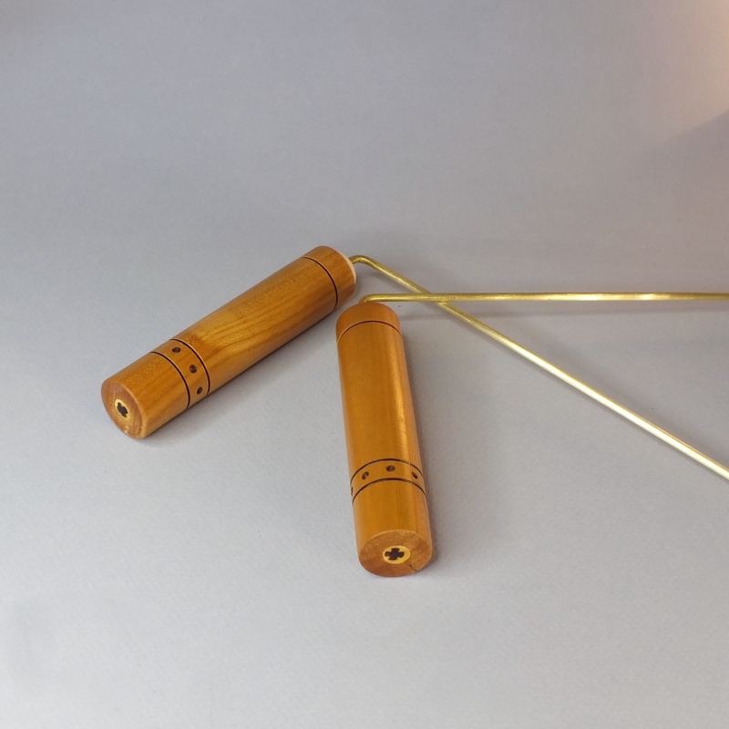 Baguettes coudées 32 cm pour la radiesthésie ___ Toutes les baguettes sont tournées et réglées dans mon atelier, dans le Maine et Loire, à la Possonnière 49170. ___ Pour le manche de ces baguettes, j'ai utilisé le merisier. Ces baguettes sont en laiton de 3 mm. Son montage est simple et efficace. Pour le transport, ces baguettes sont maintenues par une poignée amovible imaginée par intuition-bois.. ___ Référence : 26-27ba-02 ___ Dimensions des baguettes : 32 cm ___ Hauteur des poignées : 11 cm ___ Hiamètre des poignées : 2,2 cm ___ Prix : 37€ port non compris.