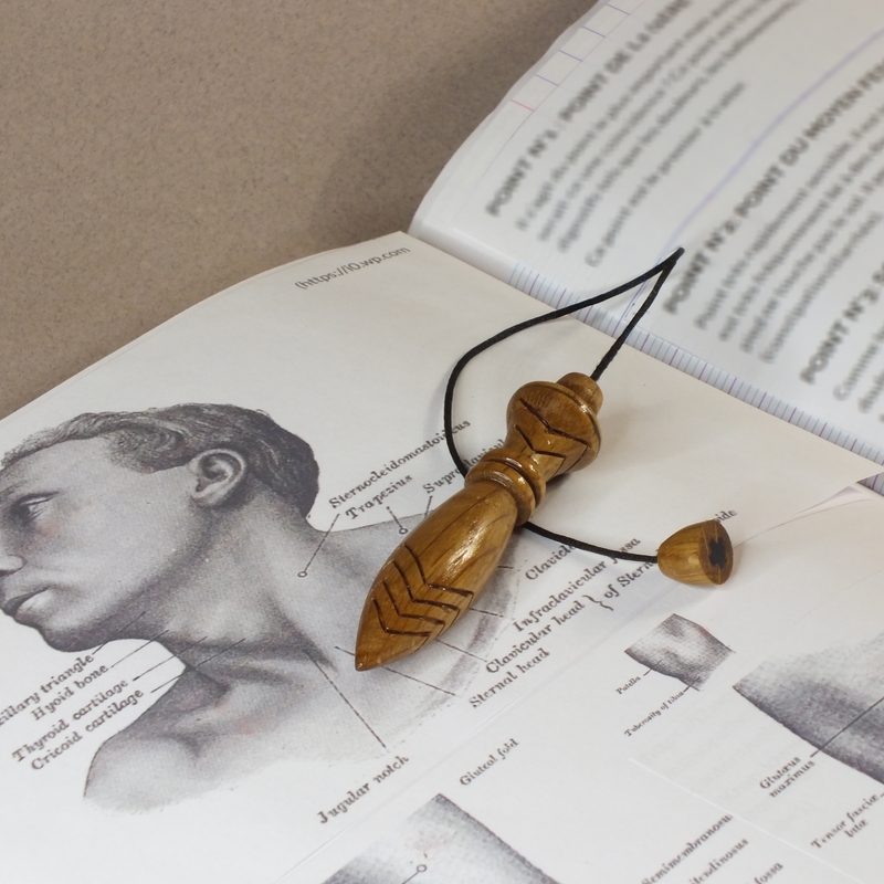 "Thot" ___ Pendule réalisé par mes soins en tournage sur bois dans mon atelier en Anjou. ___ Tourné en bois de chêne, lesté pour obtenir le poids idéal du pendule de Thot. Respecte le nombre d'or dans sa forme (1,618 cm) et la taille (7 cm de la pointe à la limite des chevrons supérieurs) Quatre chevrons à sa base et deux dans sa hauteur. ___ Le pendule de Thot, à la fois émetteur et récepteur. C’est sa forme et les dessins (chevrons) qui déterminent en grande partie la nature de ses propriétés émettrices et réceptrices.(Ondes de formes) ___ Le pendule de Thot est un émetteur puissant et cela en fait un outil de choix pour « charger » l’eau, un objet ou un lieu. ___ De plus, c’est un pendule neutre qui ne nécessite pas d’être purifié avant chaque utilisation. ___ Symbolisme : Le chêne : Arbre sacré pour de nombreux peuples, le chêne est le symbole de la force et de la longévité. Les celtes mais aussi les grecs le vénéraient pour ses qualités. Il était considéré comme le temple des Nymphes. Connu pour être le messager des Dieux, cet arbre massif est le sujet de nombreuses légendes. ___ C'est une pièce unique, ainsi vous recevrez le pendule que vous voyez en photo. ___ Des petites imperfections peuvent se voir sur la surface en fonction du type de bois (Nœuds, blessures ....), cela ne remet pas en cause la qualité du pendule. ___ Référence : 25-44tb-10