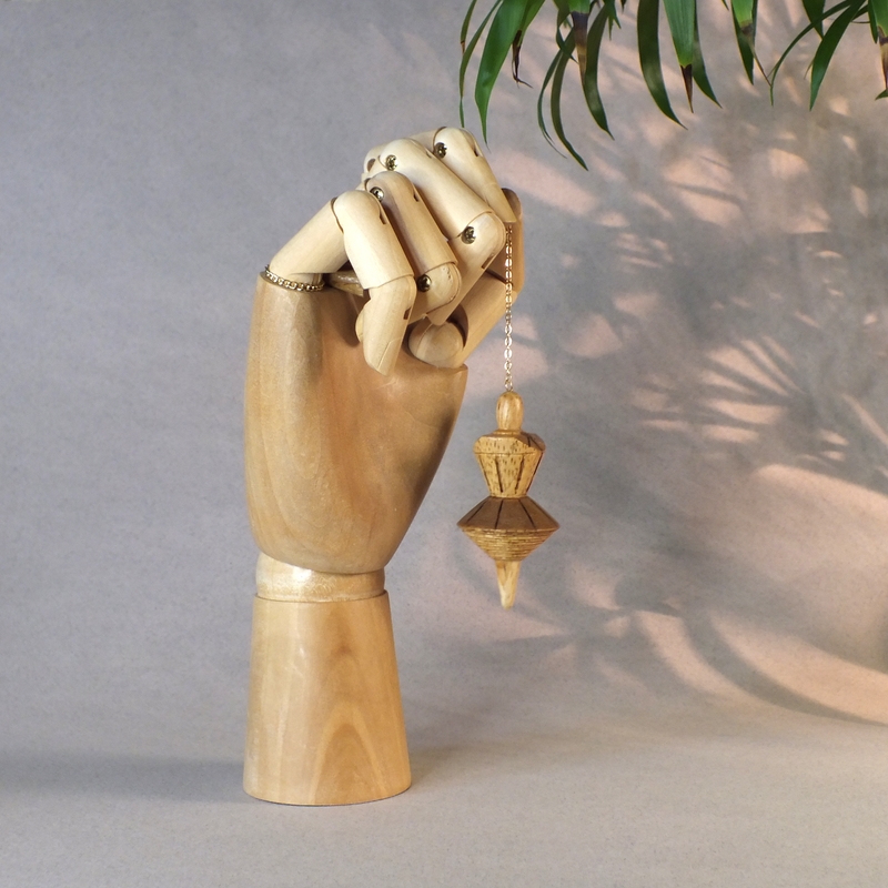 "Saltatio*" ___ Pendule réalisé par mes soins en tournage sur bois dans mon atelier en Anjou. ___ Pendule pour débuter en radiesthésie, son poids léger en fera un compagnon idéal pour l'apprentissage. Il a été tourné dans du bois de hêtre. ___ Symbolisme du hêtre : Fagus sylvatica, la sagesse Avec le chêne, le bouleau et l’olivier, c’est l’un des quatre piliers de l’année solaire chez les anciens Celtes. Le hêtre nous introduit dans le monde des géants. Ne souffrant d’aucune concurrence, il constituait l’essence dominante de la forêt primitive d’Europe. ___*Saltatio, latin de 'dance' ___ C'est une pièce unique, ainsi vous recevrez le pendule que vous voyez en photo. ___ Des petites imperfections peuvent se voir sur la surface en fonction du type de bois (Nœuds, blessures ....), cela ne remet pas en cause la qualité du pendule. ___ Référence : 25-59tb-12