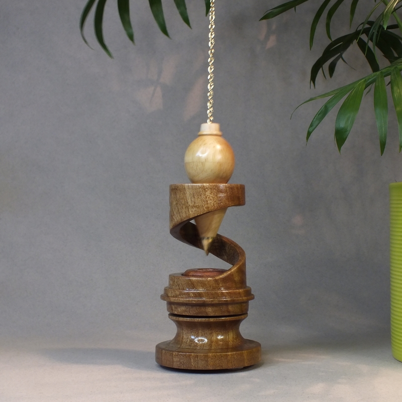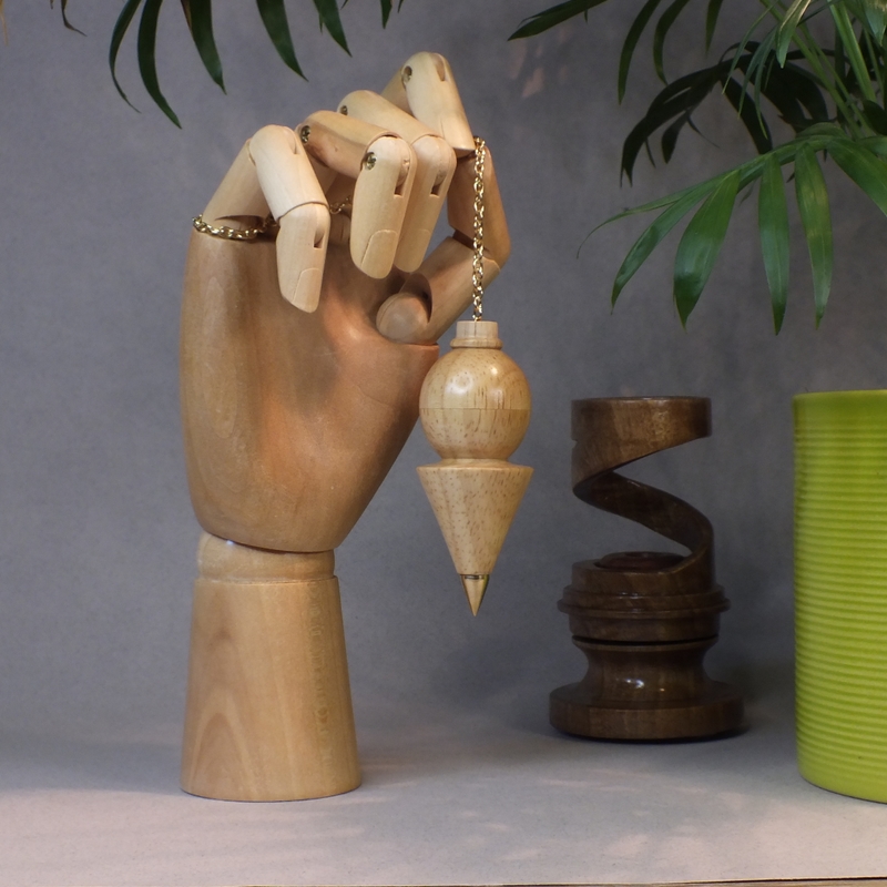 "Occultus" * ___ Le premier pendule de radiesthésie sans chaine apparente ! ___ Réalisé à la main en tournage sur bois dans mon atelier à La Possonnière 49170, en Anjou. ___ C'est un pendule en bois de hêtre pour la radiesthésie classique, tout type de recherche. Support original en bois de noyer, sur base tournante n'ayant pas de relation avec le pendule (Juste pour le décor). Votre bureau n'attend plus que lui ! ___ Sa pointe effilée en laiton poli facilitera la recherche sur plan ou photo. ___ Pour radiesthésistes débutants ou confirmés qui aiment les pendules de poids moyennement lourds (35g). ___ C'est une pièce unique, ainsi vous recevrez le pendule que vous voyez en photo. ___ Pour créer mes pendules de radiesthésie, j'utilise des bois de ma région à plus de 90% et bois exotiques de réemploi. ___*Occultus, Latin de 'Occulte (secret)' ___ Référence : 26-17bp-01