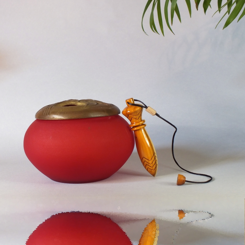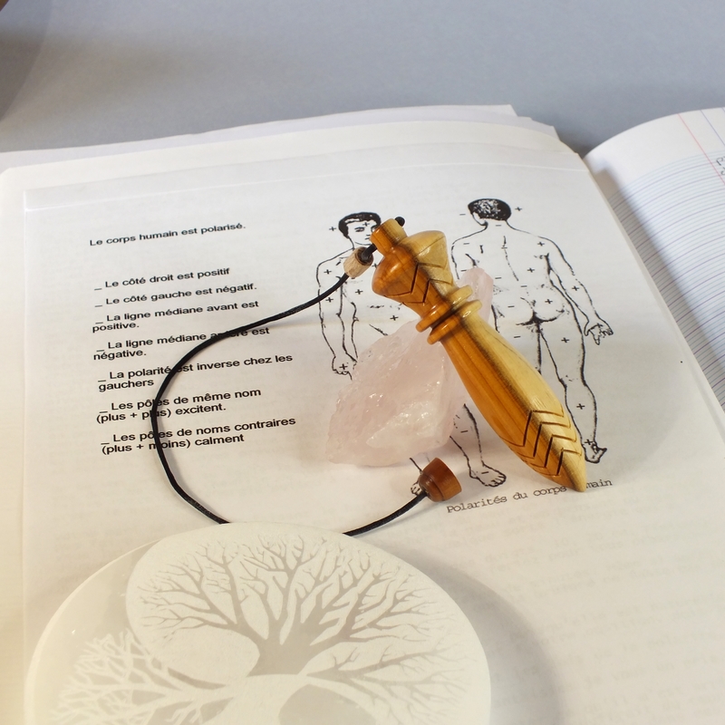 Pendule réalisé par mes soins en tournage sur bois dans mon atelier en Anjou. ___ Tourné en bois d'If, lesté pour obtenir le poids idéal du pendule de Thot (22g). ___ Respecte le nombre d'or dans sa forme (1,618 cm) et la taille (7 cm de la pointe à la limite des chevrons supérieurs) ___ Quatre chevrons à sa base et deux dans sa hauteur. ___ Ce pendule a été travaillé dans du bois d'If, mi-aubier, mi-coeur, ce qui lui donne son originalité. ___ Le pendule de Thot, à la fois émetteur et récepteur. Ce sont ces formes et les dessins (chevrons) qui déterminent en grande partie la nature de ses propriétés émettrices et réceptrices.(Ondes de formes) Le pendule de Thot est un émetteur puissant et cela en fait un outil de choix pour « charger » l’eau, un objet ou un lieu. ___ De plus, c’est un pendule neutre qui ne nécessite pas d’être purifié avant chaque utilisation. ___ Symbolisme de l'If: Dans le domaine ésotérique, l’if commun est souvent utilisé dans les rituels de transformation et de renaissance. Ses feuilles persistantes et son bois dense en font un symbole de longévité et de résistance. L’if est souvent associé à la magie et à la divination, utilisée pour se connecter aux esprits et aux ancêtres. ___ C'est une pièce unique, ainsi vous recevrez le pendule que vous voyez en photo. ___ Des petites imperfections peuvent se voir sur la surface en fonction du type de bois (Nœuds, blessures ....), cela ne remet pas en cause la qualité du pendule. ___ Référence : 26-77tb-03 Dimensions : Haut : 8 cm Diamètre : 1,618 cm Poids : 22 g Cordon : 22 cm Prix : 38 € port non compris.