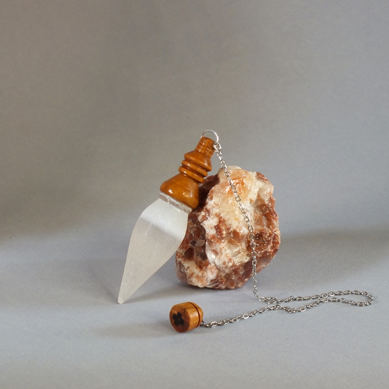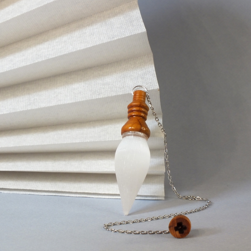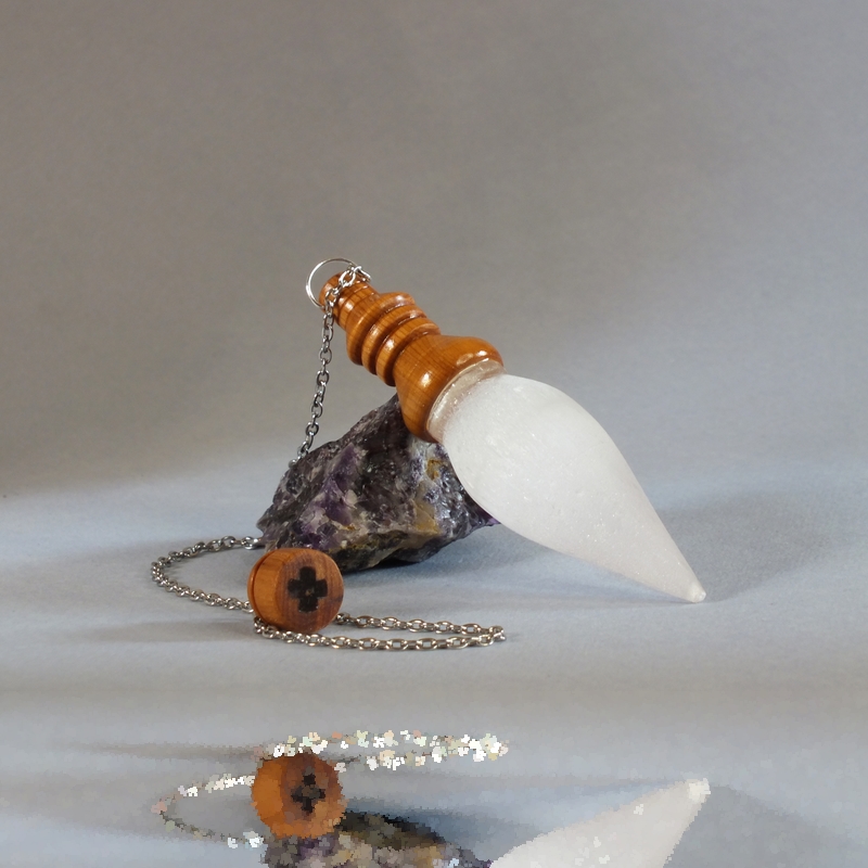"Lapis specularis" ___ Pendule en bois d'If et pierre de sélénite, pour la radiesthésie classique, réalisé par mes soins en tournage sur bois dans mon atelier en Anjou. ___ Pendule très bien équilibré, d'un poids de 19g , utilisation très agréable et précise pour tout type de recherche. La sélénite est une variété de gypse caractérisée par sa transparence et son éclat satiné. De par sa dureté très faible, c'est une pierre assez fragile mais qui vous procurera beaucoup de plaisir, autant de temps que vous en prendrez soin. En lithothérapie, elle agit pour Favoriser la paix intérieure, calme le stress et l’anxiété, stimule la régénération cellulaire et préserve les signes de vieillissement, améliore la qualité du sommeil. Mais aussi, ouvre le chakra couronne, favorise la connexion spirituelle et l’intuition. C'est une pièce unique, ainsi vous recevrez le pendule que vous voyez en photo. * "Lapis spécularis", du latin 'pierre fenêtre'. Référence : 26-34bp-03 Prix : 40 € port non compris.