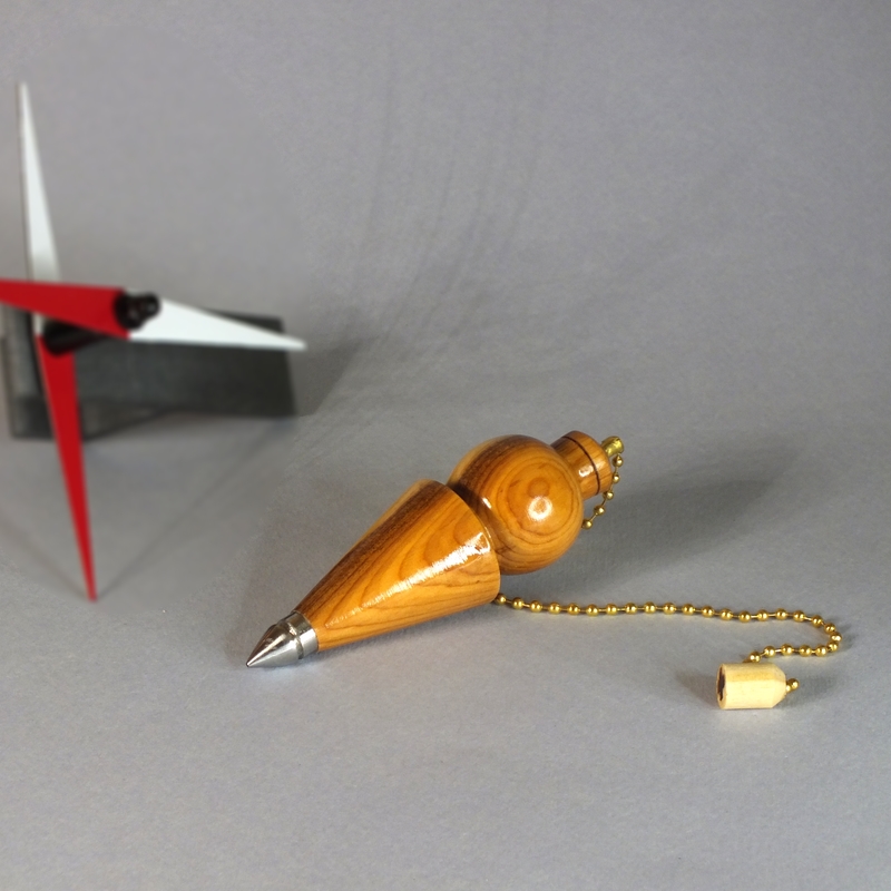 "Lascivia IV"* ___ Pendule réalisé à la main en tournage sur bois dans mon atelier, en bord de Loire, près d'Angers. ___ Pendule tourné dans du bois d'If, âme d'acier inox. Finition: Vernis acrylique. ___ Pendule étudié pour la radiesthésie physique (Moderne). Il est capable de capter la totalité des ondes naturelles, quelles soient magnétiques, électriques, radioactives ou autres**. Il est également possible de l'utiliser pour la radiesthésie classique. ___ Pour radiesthésistes débutants ou confirmés qui aiment les pendules de poids moyennement lourds (34g). ___ C'est une pièce unique, ainsi vous recevrez le pendule que vous voyez en photo. ___ Pour créer mes pendules de radiesthésie, j'utilise des bois de ma région à plus de 90%. ___ *Lascivia IV, quatrième du nom. **Utilisé avec la double antenne. (Voir le site internet Reviha.org, la radiesthésie étonnante) ___ Référence : 26-75bm-03 Dimensions : Haut : 8 cm Diamètre : 2,5 cm Poids : 34 grammes Chainette : 18 cm Prix : 38 € port non compris.