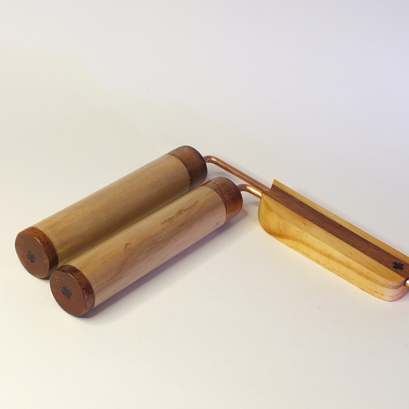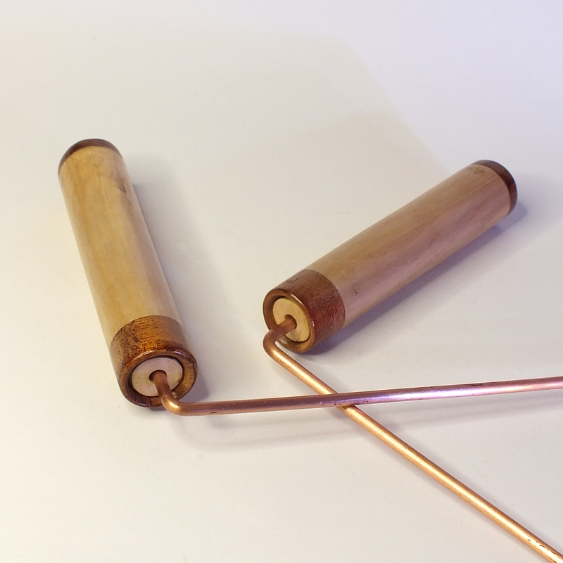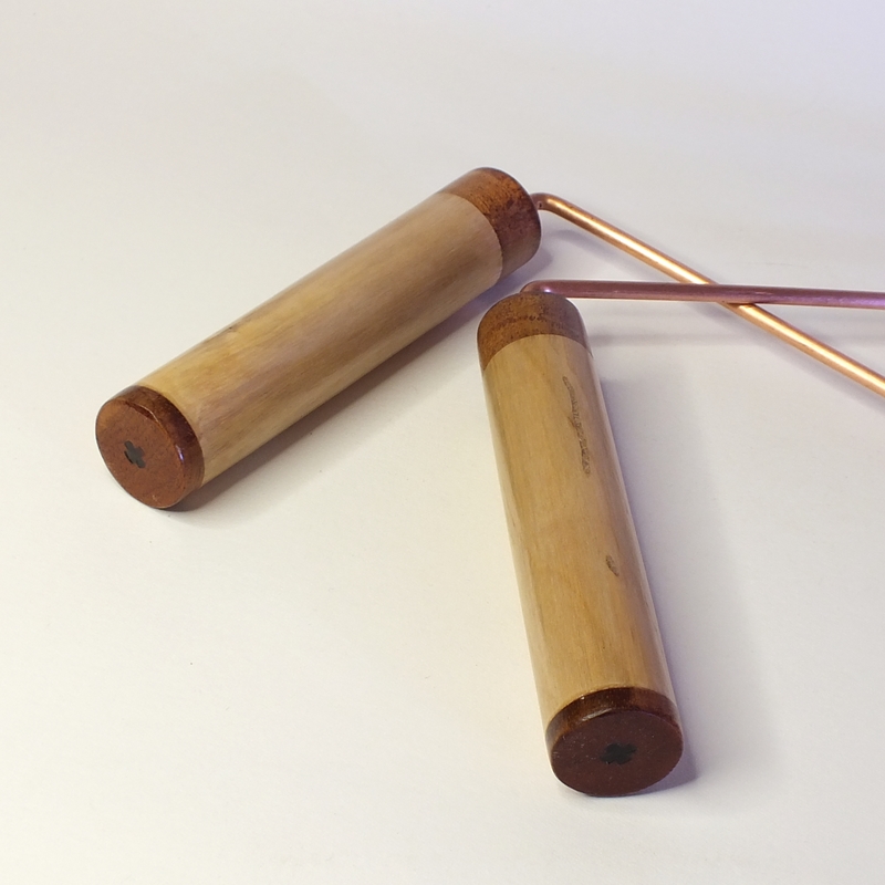 Baguettes coudées cuivre, pour la radiesthésie ___ Toutes les baguettes sont tournées et réglées dans mon atelier, dans le Maine et Loire, à la Possonnière 49170. ___ Pour le manche de ces baguettes, j'ai utilisé le chataignier et un bois exotique. ___ Ces baguettes sont en véritable cuivre. Monté sur roulements à aiguilles pour une sensibilité accrue. De par leur poids, l'utilisation par vent fort ne gêne pas leur utilisation. Pour le transport, ces baguettes sont maintenues par une poignée amovible imaginée par intuition-bois.. ___ Référence : 25-12ba-09 ___ Dimensions des baguettes cuivre : 30 cm hauteur des poignées : 11 cm diamètre des poignées : 2,5 cm ___ Prix : 45€ port non compris.